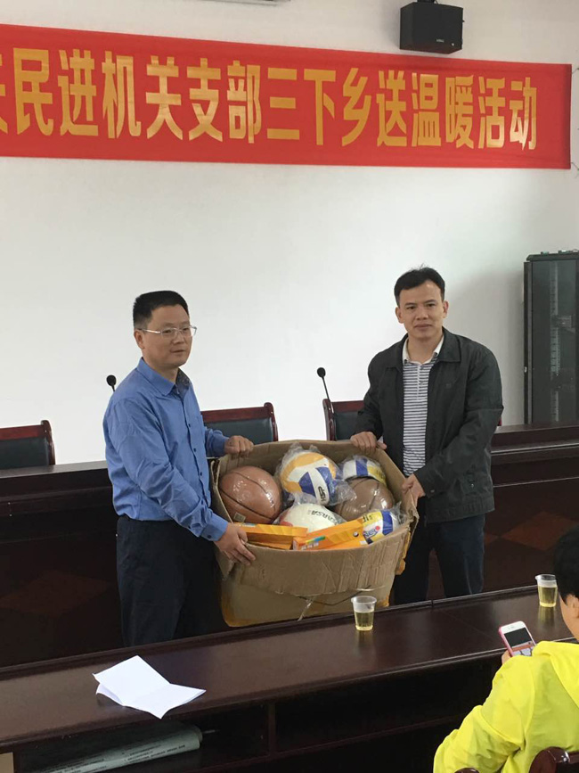 近日,民进韶关学院支部和机关支部联合赴仁化县董塘镇董塘中学开展三下乡送温暖活动。此次活动由民进韶关学院支部策划组织,民进机关支部和韶关学院支部的会员,以及民进企业家会员黄有来、廖招丘、张玉虹等,共同为董塘中学和该校部分困难学生捐助了价值近万元的体育用品、学习文具一批。“三下乡”活动得到了韶关学院党委统战部的大力支持,刘诗慧科长全程参与和指导。