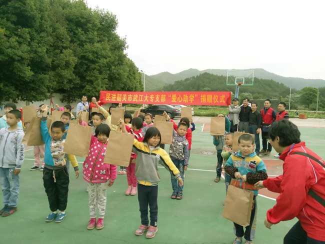 在捐赠仪式上,南雄夹河口村小学负责人王校长致欢迎词,对韶关民进武江大专支部的关心和赠送义举表达了谢意,并希望更多的爱心人士关心贫困山区孩子的教育,同时激励广大学生要努力学习,将来长大后报效祖国回报社会。民进韶关市委秘书长邓华同志、民进韶关武江大专支部主委吕伟和此次义赠活动发起人罗鸣亮同志作为代表向南雄夹河口村小学和学生赠送物品,包括教学设备,学生活动器材,学生学习用品,学生书籍等价值一万多元,此次开展义赠活动经费全部由会员罗鸣亮同志赞助。