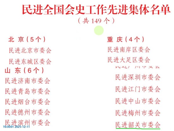 在庆祝中国民主促进会成立80周年之际,民进中央对一批先进集体与优秀会员予以表彰。韶关民进组织和会员荣获多项表彰:民进韶关市委会荣获“民进全国会史工作先进集体”称号,民进乐昌市支部荣获“民进全国先进基层组织”称号,市政协副主席、民进韶关市委会主委刘大济荣获“民进全国双岗建功优秀会员”称号。
